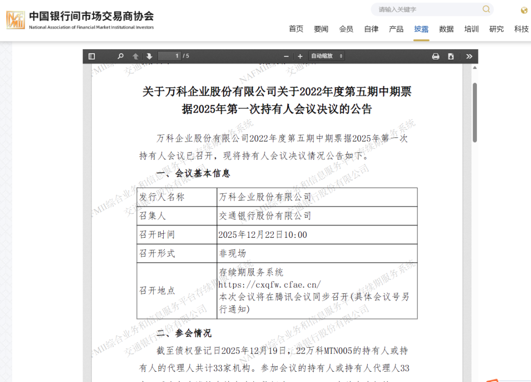 据公告,截至债权登记日2025年12月19日,22万科MTN005的持有人或持有人的代理人共计33家机构。参加会议的持有人或持有人的代理人33家。