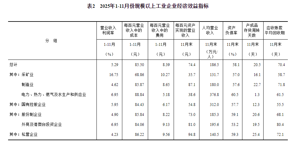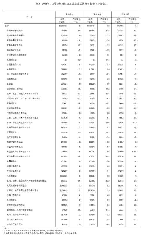 据国家统计局数据,1-11月全国规模以上工业企业实现利润总额66268.6亿元,同比增长0.1%。