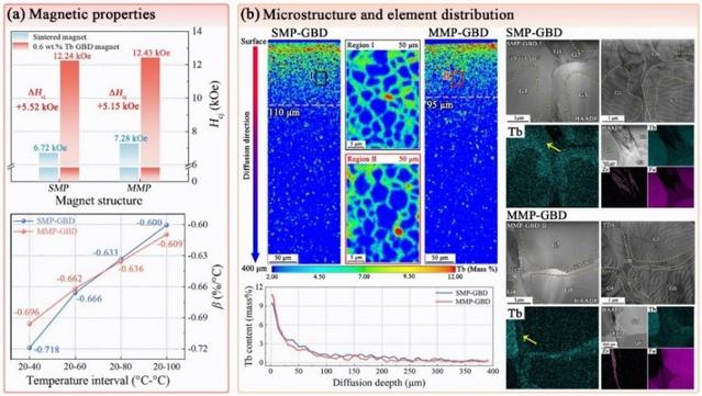 图(a)烧结和晶界扩散磁体的磁性能及矫顽力温度系数变化,(b)晶界扩散磁体的微观结构与元素分布。安徽大学供图