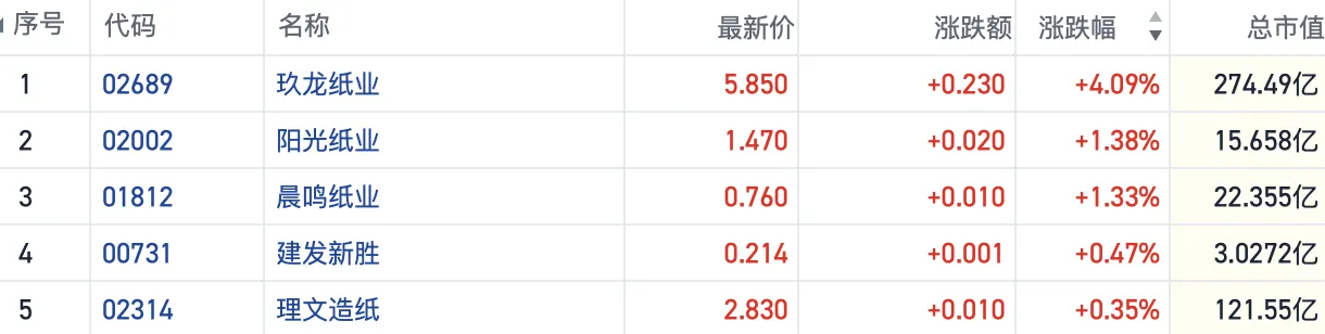 截至发稿,玖龙纸业(02689.HK)涨超4%,阳光纸业(02002.HK)、晨鸣纸业(01812.HK)涨约1%,理文造纸(02314.HK)跟涨。
