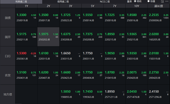具体来看,银行间主要利率债收益率全线上行,截至下午16:30分,10年期国债活跃券250016收益率上行2.25bp报1.858%,10年期国开债活跃券250025收益率上行3bp至1.9365%,30年期国债活跃券2500006收益率上行3.25bp至2.2535%。