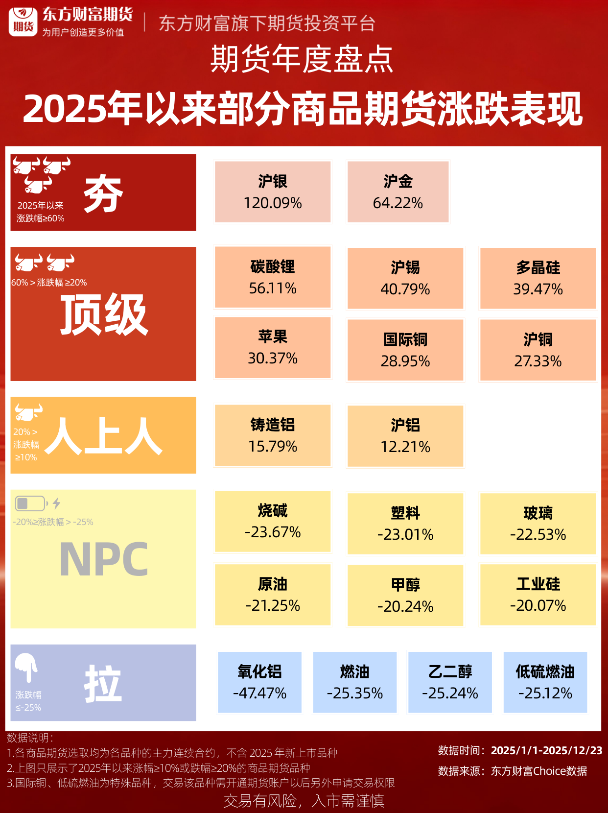 2025年期货市场收官倒计时!回顾2025年商品期货涨跌表现,我们梳理出涨跌表现较为突出的商品,「从‘夯’到‘拉’」。速来解锁吧~