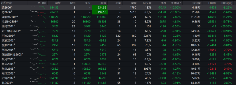 截至今日白天收盘,铂和钯期货在期货主力合约中领跌,均在尾盘跌停,收跌10%。跟随其后的是碳酸锂主力期货合约,虽然尾盘触及跌停,但随后跌停板短暂打开,收跌7.89%。