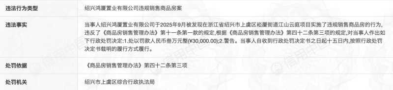 根据信用中国官网,12月22日,绍兴市上虞区综合行政执法局对绍兴鸿厦置业有限公司进行警告并处以3万元罚款,违法行为是违规销售商品房案。