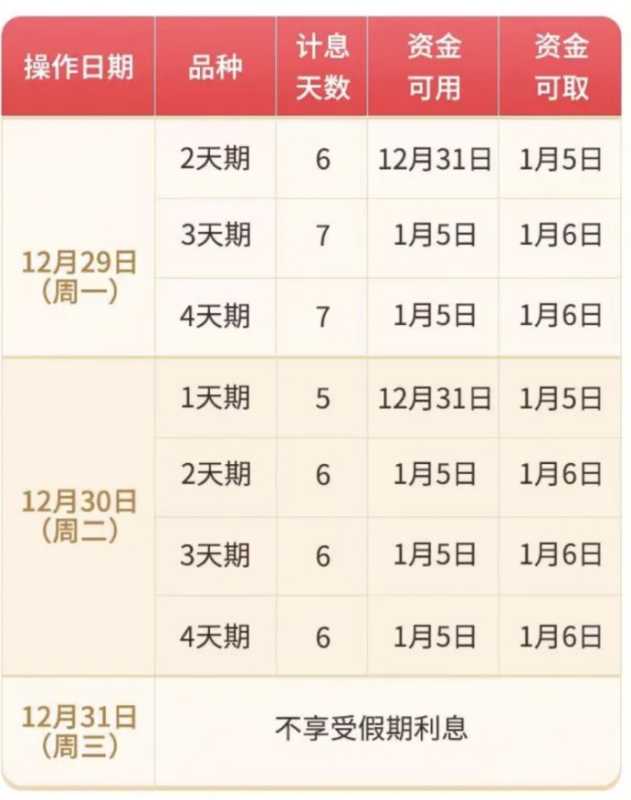 投资者需要注意的是,元旦小长假前的最后一个交易日——本周三(2025年12月31日),无论操作1天期、2天期、3天期还是4天期交易所国债逆回购,计息天数均仅为1天,无法享受假期利息。