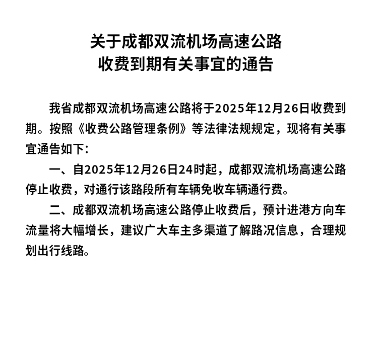 自2025年12月26日24时起,成都双流机场高速公路停止收费。