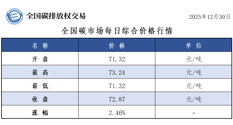 新华财经北京12月30日电 据微信公众号“全国碳交易”,全国碳市场综合价格行情于当日开盘价71.32元/吨,最高价73.24元/吨,最低价71.32元/吨,收盘价72.87元/吨,收盘价较前一日上涨2.46%。