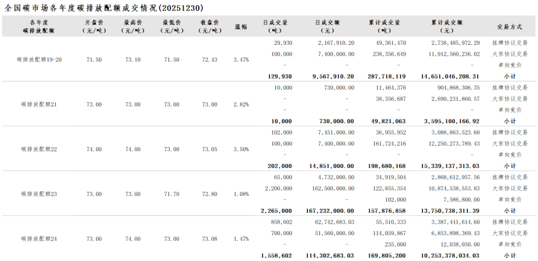 2025年1月1日至12月30日,全国碳市场碳排放配额成交量233,632,744吨,成交额14,556,672,930.17元。