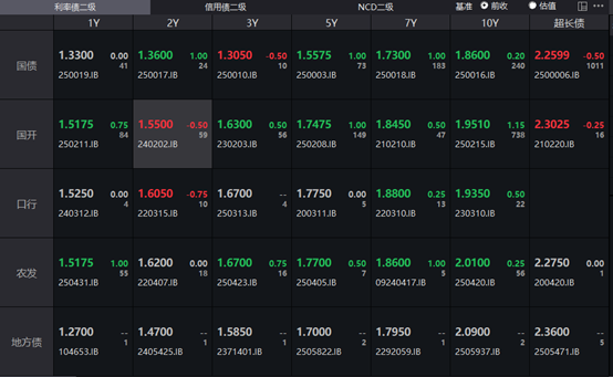 具体来看,银行间主要利率债收益率多数上行,截至下午16:30分,10年期国债活跃券250016收益率上行0.2bp报1.86%,10年期国开债活跃券250215收益率上行1.15bp至1.951%,30年期国债活跃券2500006收益率下行0.5bp至2.2599%。