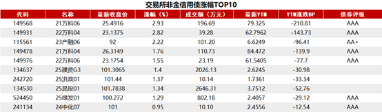 交易所债券市场收盘,据Choice 数据统计显示,今日交易所市场非金信用债涨幅排行前五的分别是:21万科06、22万科04、23产融06、21万科04、22万科06。具体如下:
