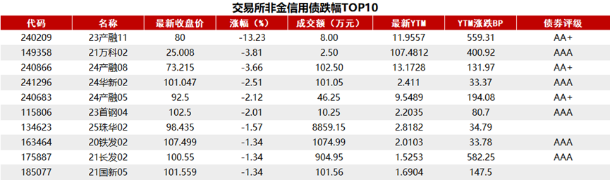 据Choice 数据统计显示,今日交易所市场非金信用债跌幅排行前五的分别是:23产融11、21万科02、24产融08、24华新02、24产融05。具体如下: