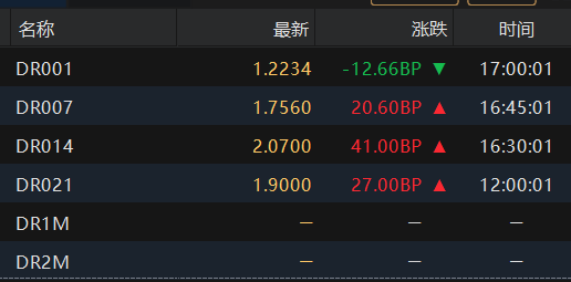 银银间回购定盘利率多数上涨。FDR001持平报1.25%;FDR007涨29.11个基点报1.85%;FDR014涨13.0个基点报1.88%。