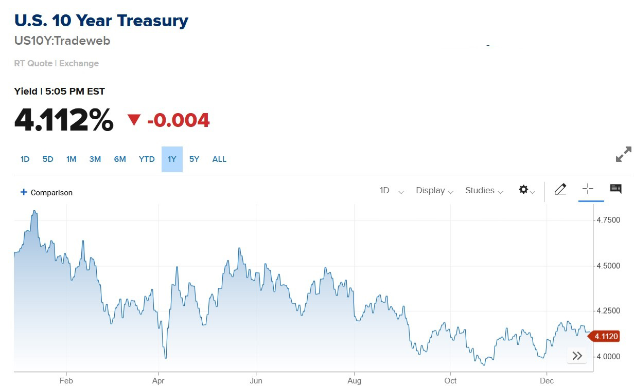 第三阶段(10-12月)是振幅收窄,等待新方向。10年期美债收益率因经济数据转弱和避险买盘介入而小幅回落,期间短暂走低至年内低点3.95%附近,年末则震荡上升至4.11%左右,反映出“货币利好”与“财政利空”的持续博弈。