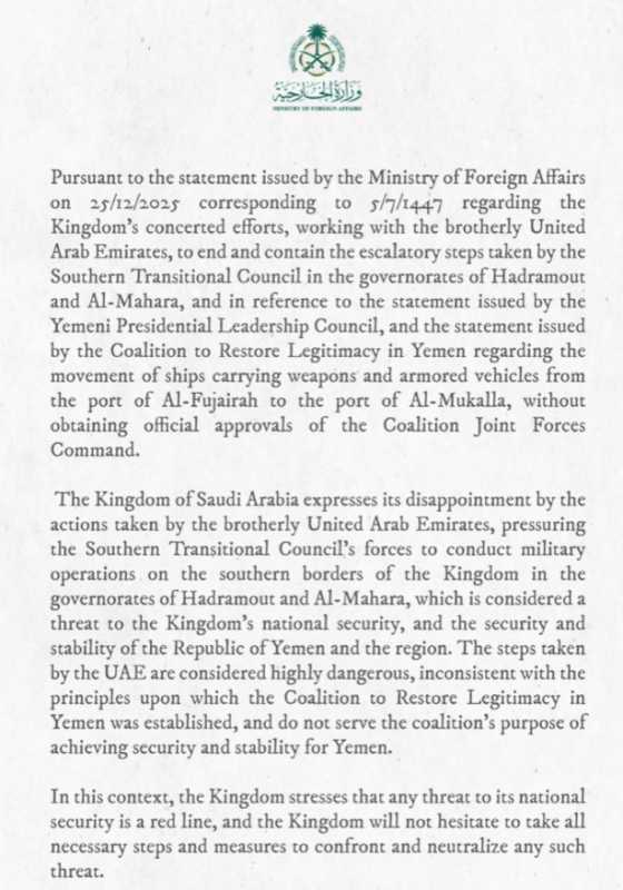 沙特在声明中表示:“在此背景下,沙特王国强调,任何对其国家安全的威胁都是不可逾越的红线,王国将毫不犹豫地采取一切必要步骤和措施,应对并消除任何此类威胁。”