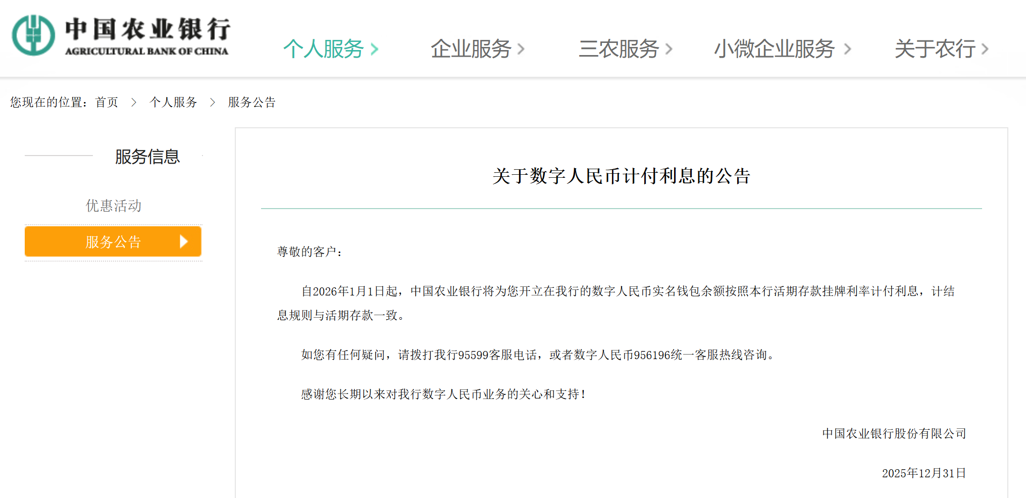 工商银行、农业银行发布公告称,自2026年1月1日起,为数字人民币实名钱包余额按照活期存款挂牌利率计付利息,计结息规则与活期存款一致。