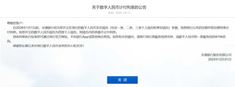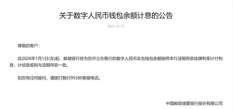 工行、农行、建行、交行、邮储银行均发布公告称,自2026年1月1日起,银行将为客户开立的数字人民币实名钱包余额按照本行活期存款挂牌利率计付利息,计结息规则与活期存款一致。