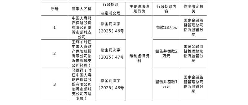 针对上述违法违规行为,国家金融监督管理总局临沂监管分局对其罚款13万元;对时任中国人寿财产保险股份有限公司临沂市郯城支公司经理王辉警告并处罚款2万元;对农险专员马景祥警告并处罚款1万元。