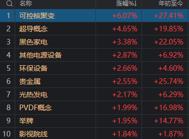 值得注意的是,我国可控核聚变技术取得突破,板块大涨6.07%,36只成分股中有11只涨停或涨超10%。该板块还带动了超导概念、电源设备、环保设备、光热发电等新能源赛道分支跟涨。