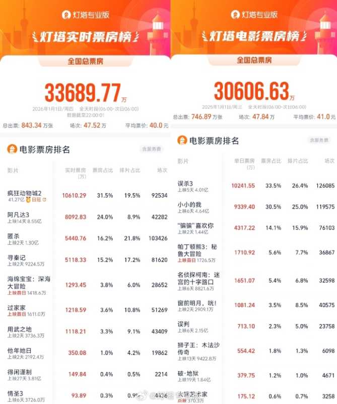 据灯塔专业版,截至1月1日22时,2026年元旦大盘票房已达3.3689亿,同比增长超10%。