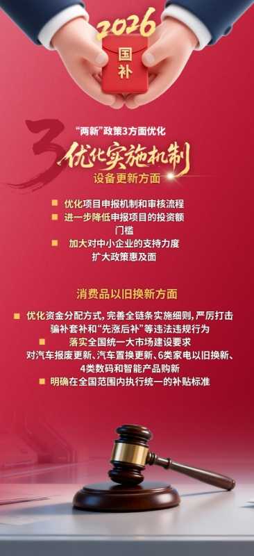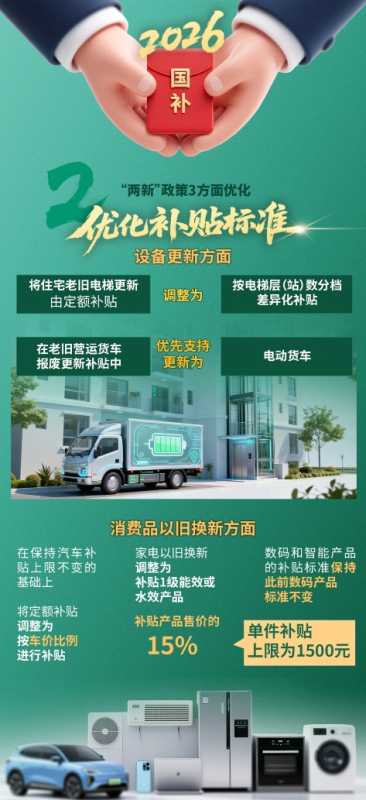 国家发展改革委、财政部印发的《关于2026年实施大规模设备更新和消费品以旧换新政策的通知》明确2026年“两新”政策的支持范围、补贴标准和工作要求。
