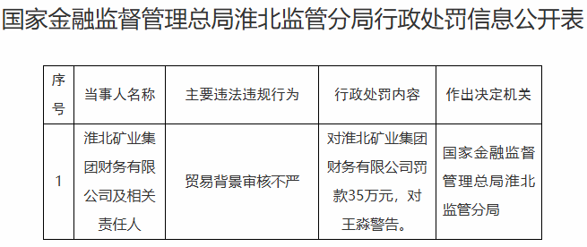 1月4日,国家金融监督管理总局淮北监管分局披露的行政处罚信息公开表显示,淮北矿业集团财务有限公司因贸易背景审核不严被罚款35万元。同时,相关责任人王淼被警告。