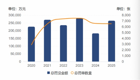 2025年我国银行业被罚没金额同比猛增四成多。南都湾财社记者根据企业预警通数据统计发现,以披露日期为准,去年,央行、金融监管总局、外管局及派出机构对我国千余家银行及其分支机构开出罚单,累计罚没26.41亿元(含个人罚金),较2024年大幅增长44.95%。罚金猛增背后是巨额罚单的频现,去年我国银行业共收到千万元级别的罚单31张,是2024年的5倍有余。