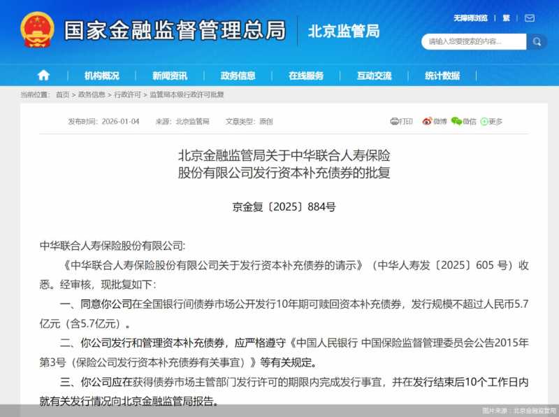 1月4日,北京金融监管局发布关于中华联合人寿保险股份有限公司(以下简称“中华人寿”)发行资本补充债券的批复表示,同意中华人寿在全国银行间债券市场公开发行10年期可赎回资本补充债券,发行规模不超过5.7亿元(含5.7亿元)。