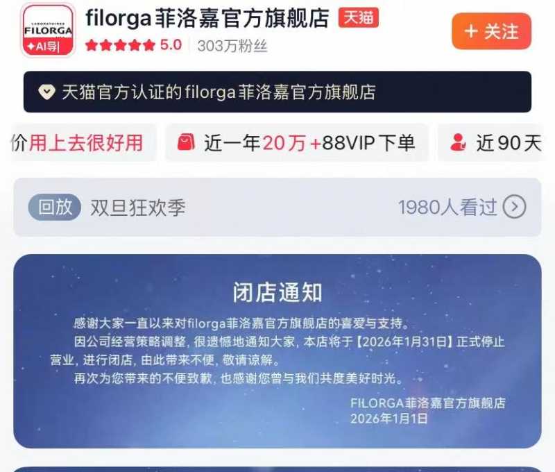 1月4日,界面新闻记者就此事查询天猫菲洛嘉官方旗舰店,店铺公告显示,因公司经营策略调整,店铺将于2026年1月31日正式停止营业,进行闭店,由此带来的不便,敬请谅解,客服回复也确认闭店一事。店铺显示有303万粉丝,去年卖出了50万+件商品。