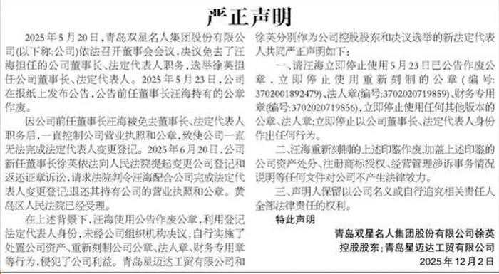 随后在2025年12月2日,儿媳徐英以“双星名人董事长”及控股股东青岛星迈达的名义发布《严正声明》称,当年5月20日,双星名人董事会决议免去汪海董事长及法定代表人职务,选举徐英接任,并称汪海签署文件及原公章失效。
