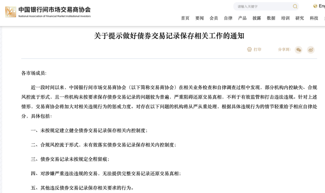 通知显示,近一段时间以来,交易商协会在相关业务检查和自律调查过程中发现,部分机构内控缺失、合规风控流于形式,且一些机构未按要求保存债券交易记录的问题较为普遍,严重阻碍还原交易真相,不利于有效监管和打击违法违规。