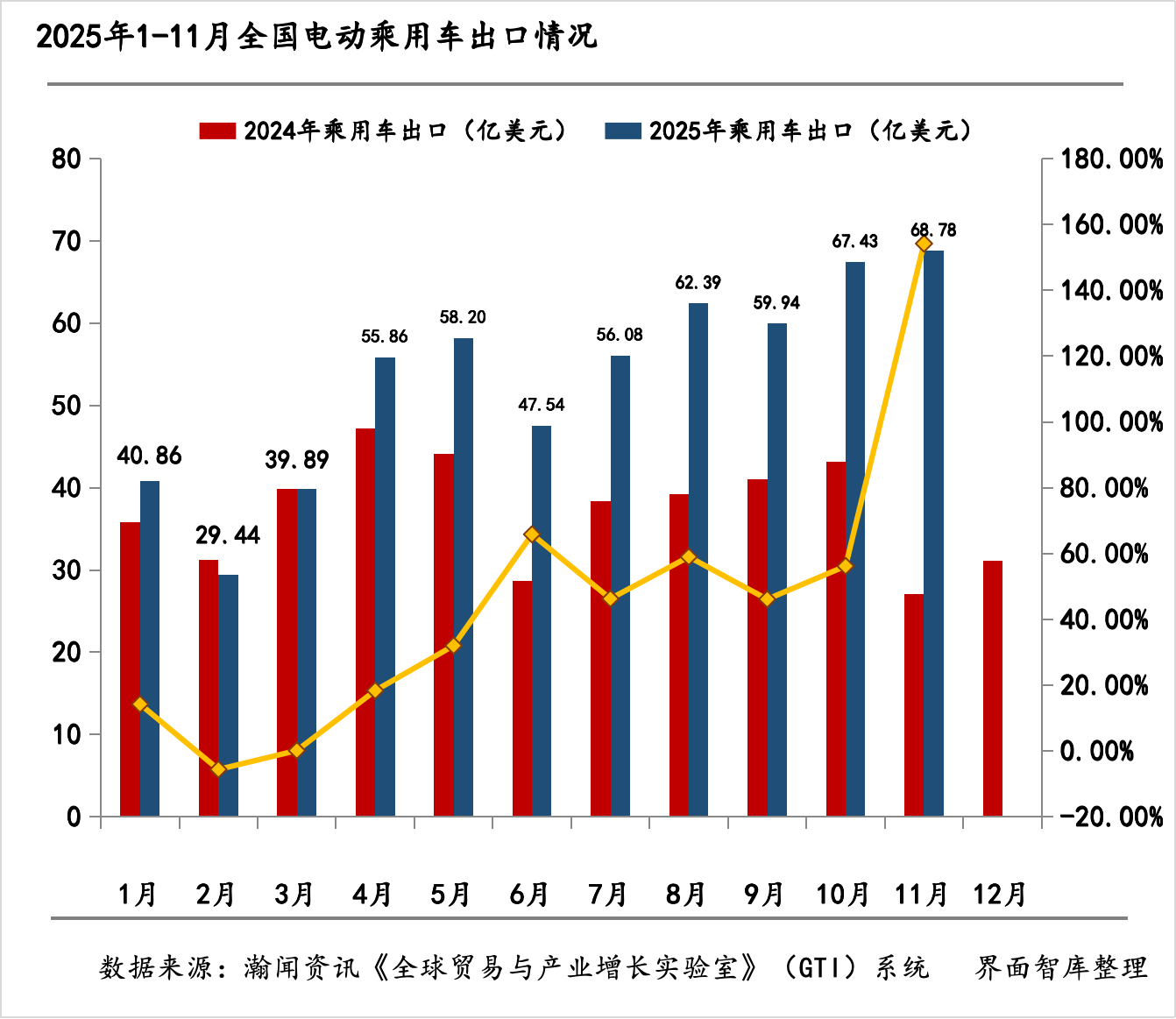 根据界面智库与瀚闻资讯统计,2025年11月,中国电动载人汽车贸易增长动能全面爆发,出口金额达70.76亿美元,同比大幅增长139.83%。