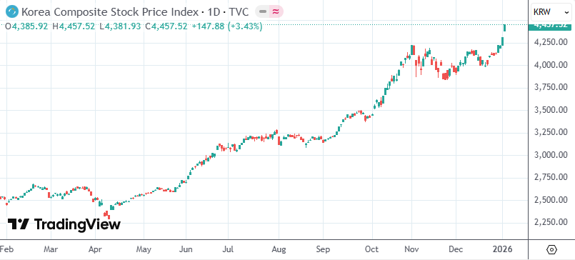 具体行情显示,韩国综合股价指数上涨3.43%报4457.52点,刷新了上周五的收盘纪录,近两个交易日累涨5.77%。去年该指数累涨75.63%,成为全球主要股市中的最牛市场。