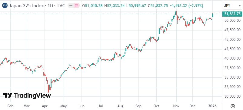 与此同时,日经225指数收涨2.97%报51832.80点,为历史次高,仅次于2025年10月31日创下的52636.87点;东证指数涨2.01%,突破了去年12月15日录得的历史纪录。