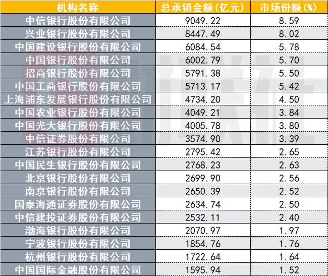 中信银行、兴业银行位居银行间市场承销额前两名,建设银行、中国银行、招商银行、工商银行其次,承销额均超过5000亿元,27家机构的承销额都超过了千亿元。除国有大行和股份制银行外,江苏银行、北京银行、南京银行、宁波银行、杭州银行等城商行的承销额居前。