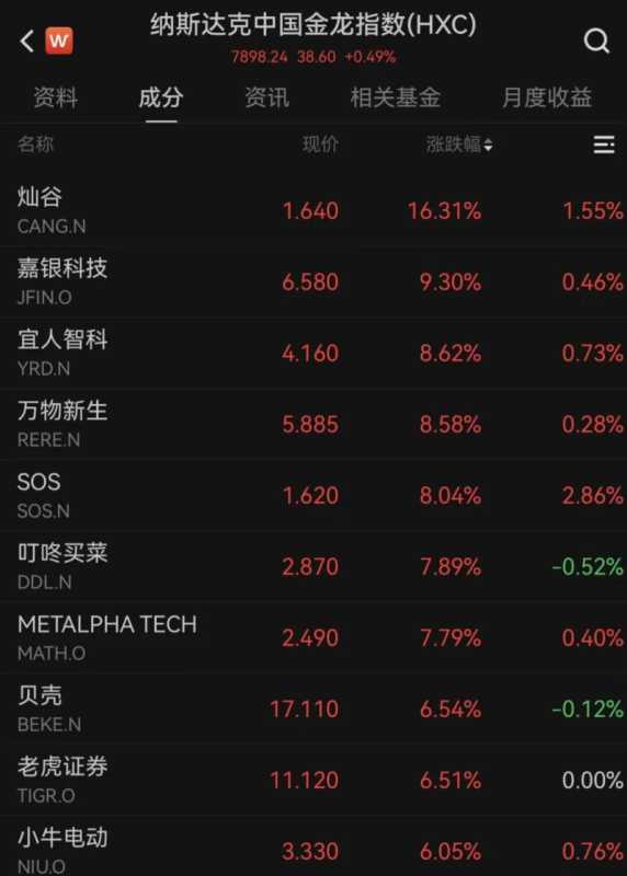 中概股走强,纳斯达克中国金龙指数涨0.49%。个股方面,灿谷涨超16%,嘉银科技涨近10%,宜人智科、万物新生、SOS涨超8%。