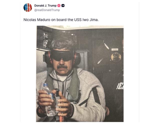 美东时间1月3日,美国总统特朗普的社交媒体账号发布了一张照片,展示了一个震惊世界的画面:头发花白、双眼被蒙、双手戴铐的委内瑞拉总统马杜罗,出现在美军“硫磺岛”号军舰上。