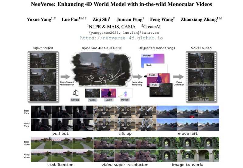 CreateAI(OTC:TSPH)近日正式发布与中国科学院自动化所共同研发的4D世界模型NeoVerse。目前,相关研究论文已在项目主页上线,供全球开发者查阅。