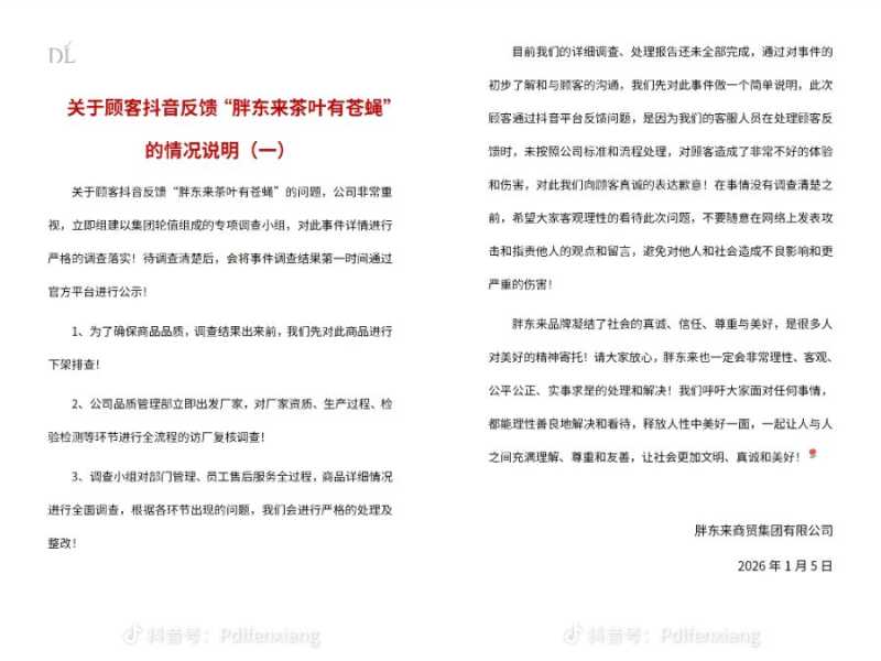 关于顾客反馈“胖东来茶叶有苍蝇”的问题,1月5日下午,胖东来在官方抖音账号情况说明称,公司非常重视,立即组建以集团轮值组成的专项调查小组,对此事件详情进行严格的调查落实。待调查清楚后,会将事件调查结果第一时间通过官方平台进行公示。