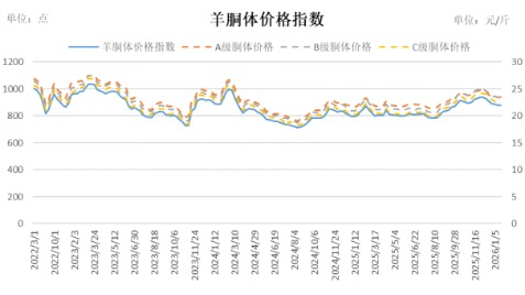 1月5日,怀仁羊胴体价格指数报879.29点,较上期上涨0.10%,A级胴体价格报23.52元/斤,较上期上涨0.09元/斤,涨幅0.38%;B级胴体价格报23.38元/斤,较上期下跌0.01元/斤,跌幅0.04%;C级胴体价格报22.47元/斤,较上期持平。