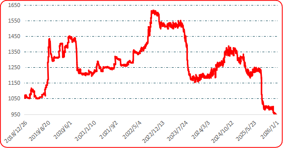 新华财经北京1月6日电截至2026年1月4日,中国遵义朝天椒(干椒)批发价格指数报929.30点,较上期(2025年12月28日,下同)下跌0.99%,其中艳椒、满天星、遵义朝天椒一号、锥形椒、樱桃形椒批发价格指数较上期均出现下行。三樱椒(干椒)批发价格指数报784.27点,较上期下跌0.16%。新一代(干椒)批发价格指数报836.32点,较上期上涨1.20%。印度进口椒批发价格指数报833.37点,较上期上涨0.74%。