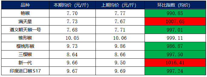 本期全国辣椒市场的8个辣椒代表品中,有2个辣椒代表品(满天星、新一代)周度(2025年12月29日至2026年1月4日)交易平均价格较上期周度(2025年12月22日至12月28日)交易平均价格有所上涨;有5个辣椒代表品(艳椒、遵义朝天椒一号、樱桃形椒、三樱椒、印度进口椒S17)交易平均价格较上期(同上)有所下跌;有1个辣椒代表品(锥形椒)交易平均价格较上期(同上)基本持平。其中新一代环比指数为1016.41点,是本期均价涨幅最大品种;其中樱桃形椒环比指数为986.87点,是本期均价跌幅最大品种。