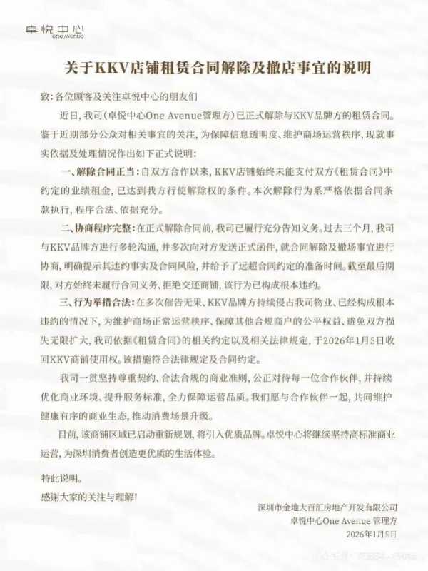 1月5日晚间,卓悦中心发布官方说明,直指KKV拖欠业绩租金,构成根本违约。