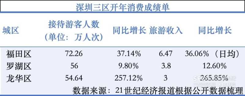 其中,福田区作为广东消费第一区,元旦三天接待游客总计72.26万人次,日均同比增长37.14%,实现旅游总收入6.47亿元,日均同比增长36.06%,同时各商圈总人流量475.32万人次,同比增长26%销售额3.87亿元同比增长17%;罗湖区喜迎游客超56万人次,同比增长9.8%,旅游收入近3.8亿元,同比增长12.6%;宝安区全区线下消费金额约13.73亿元;同比增长35.55%;龙华区累计接待游客54.64万人次,较2025年同比激增257.12%;旅游收入突破3亿元,同比涨幅高达265.85%,游客接待量与旅游收入均创下同期新高。