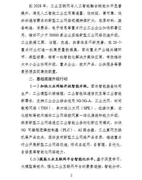 工信部印发《工业互联网和人工智能融合赋能行动方案》,目标到2028年提升融合赋能水平,推动不少于5万家企业实施新型工业网络改造升级。