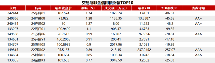 据Choice 数据统计显示,今日交易所市场非金信用债涨幅排行前五的分别是:25东科01、24产融08、24产融02、22周口01、21万科06。具体如下: