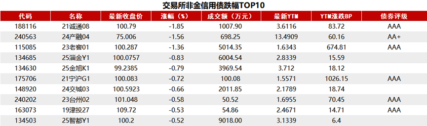 据Choice 数据统计显示,今日交易所市场非金信用债跌幅排行前五的分别是:21诚通08、24产融04、23老窖01、25淄金Y1、25金旭K1。具体如下: