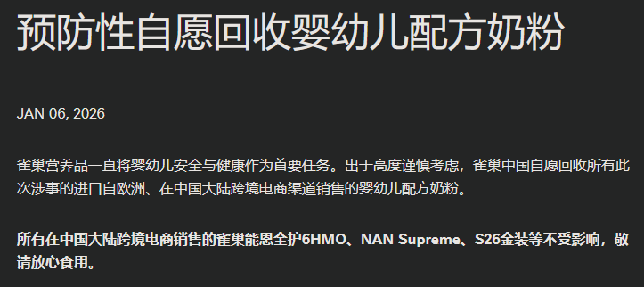 同日,雀巢中国网站发布2条“预防性自愿回收婴幼儿配方奶粉”公告,拟对“Nestlé BEBA Supreme”“惠氏Wyeth启赋未来”等41个涉事批次进口自欧洲、在中国大陆跨境电商渠道销售的婴幼儿配方奶粉进行预防性召回,同时回收30批次在中国大陆销售的特定批次婴幼儿配方奶粉(包含1款儿童奶粉),合计召回71批次。截至目前,雀巢尚未收到与相关产品有关的任何不适报告。