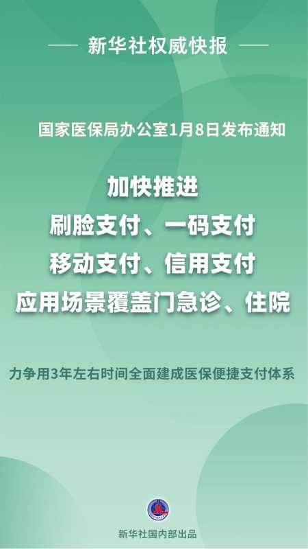 国家医保局发布通知,明确加快推进刷脸支付、一码支付、移动支付、信用支付在各类医疗场景落地,力争用3年左右时间全面建成医保便捷支付体系。
