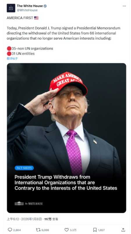 据央视新闻报道,美国总统特朗普签署备忘录,指示美国退出66个“不再符合美国利益”的国际组织。此举标志着特朗普政府进一步放弃了全球合作。