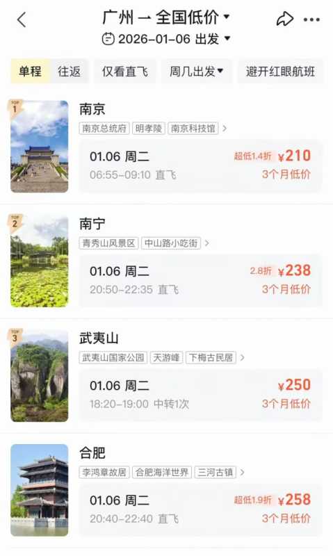 据广州日报,记者在一家第三方售票平台查询发现,近期从广州出发去往多个城市的机票价格低至两百多元。